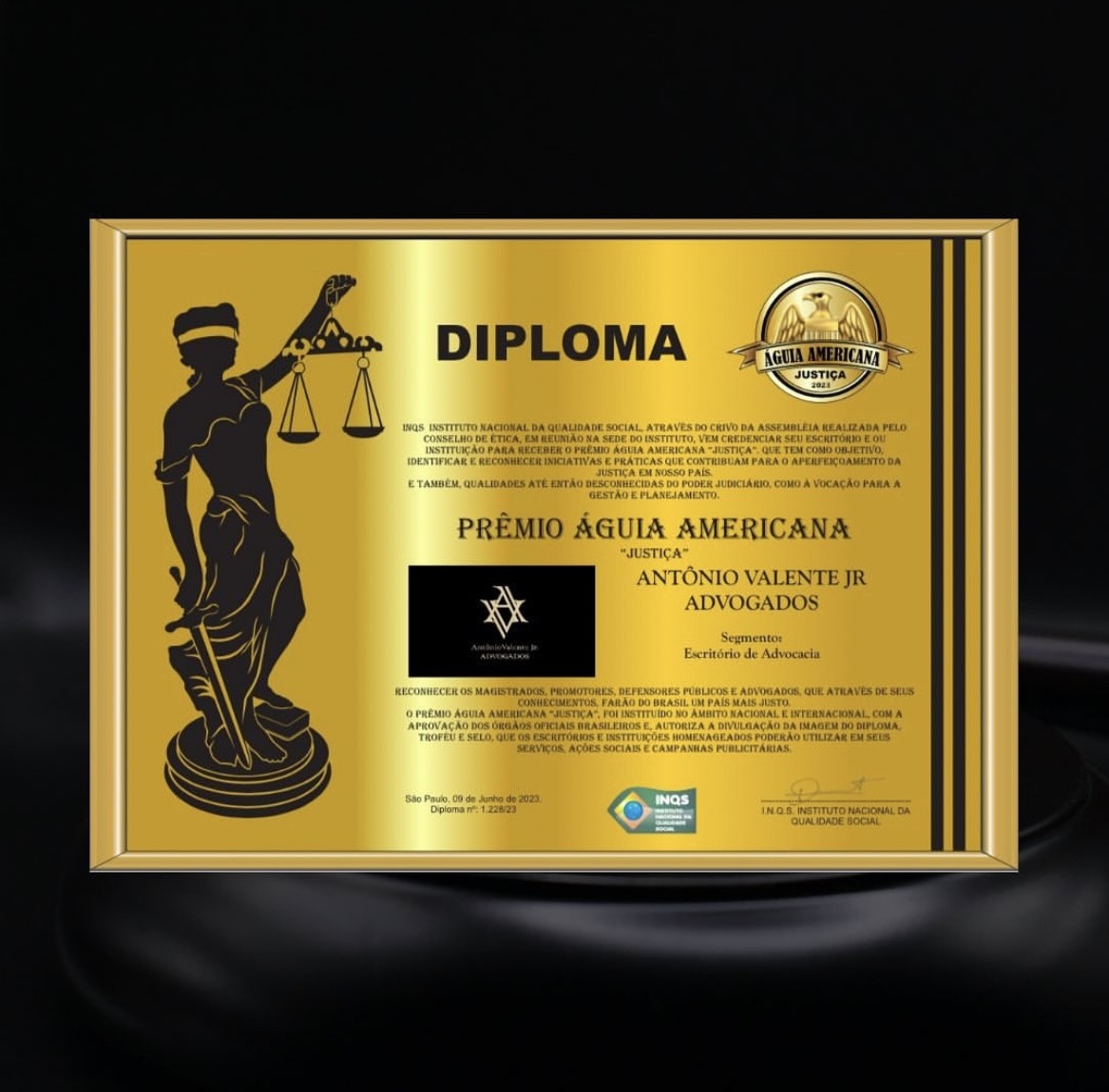 “Instituto Nacional da Qualidade Social, através do crivo da Assembleia realizada pelo conselho de ética, em reunião na Sede do Instituto, vem credenciar seu escritório para receber o Prêmio Águia Americana “Justiça”. Que tem como objetivo identificar e reconhecer iniciativas e práticas que c…Leer más