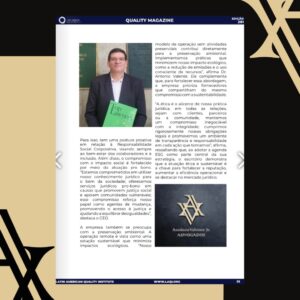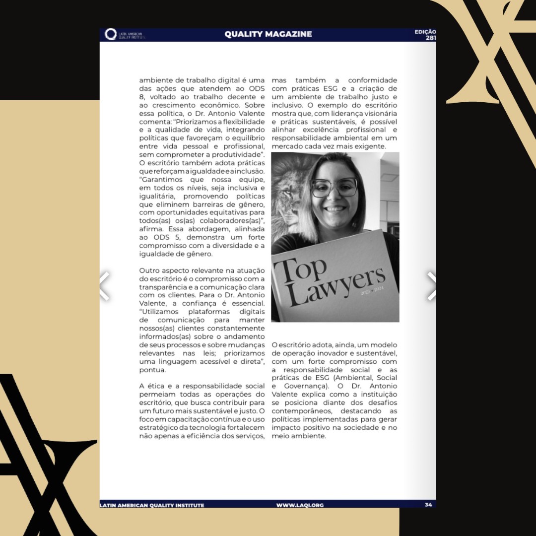 É com grande orgulho que nosso escritório foi reconhecido pela Quality Magazine como uma referência no mercado jurídico por nossa atuação inovadora, sustentável e comprometida com a ética e a responsabilidade social.